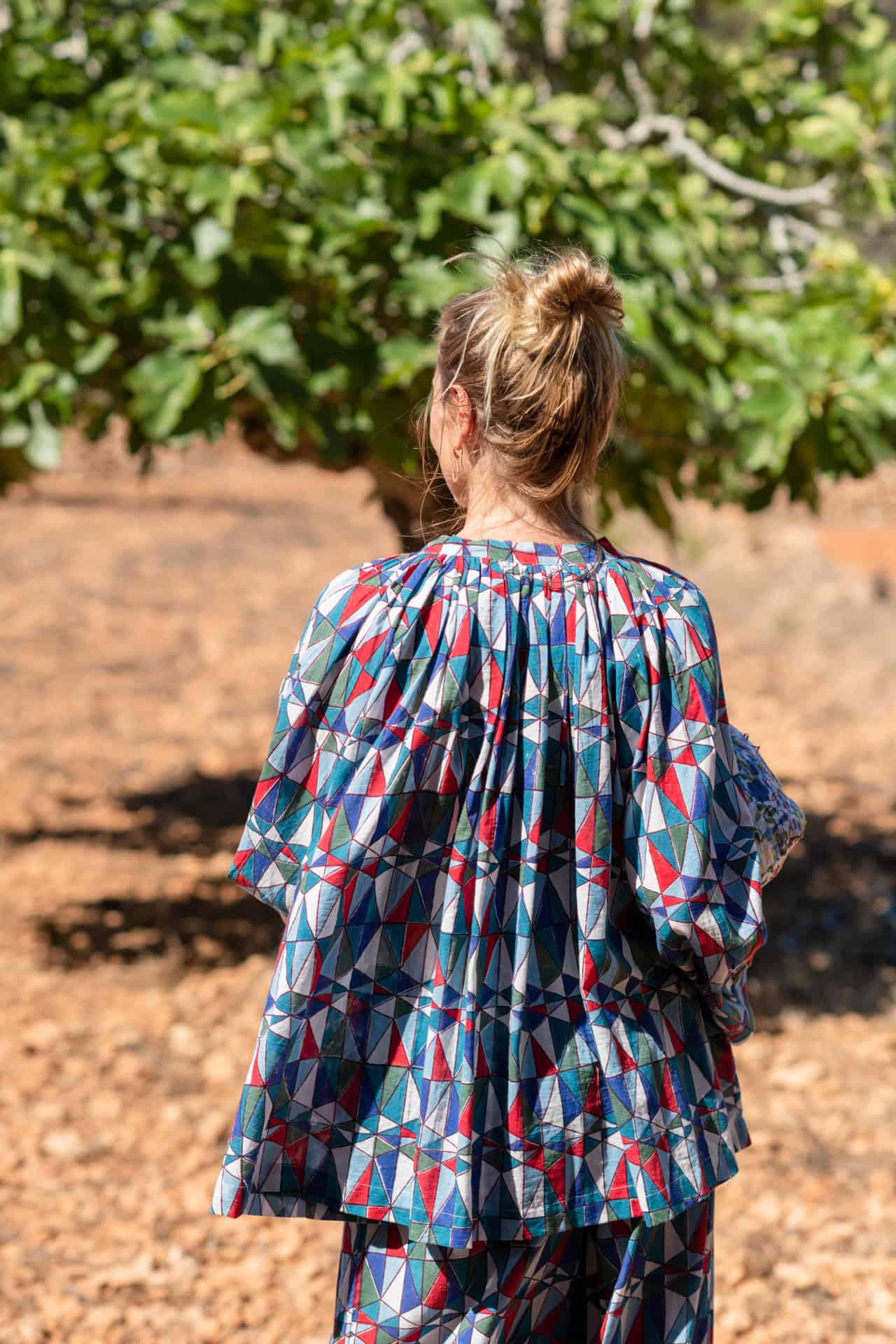 The Sunny Blouse is made from 100% cotton and is hand block printed.. Perfect for casualwear but great for special occasions too – wear it with the matching Sunny Trousers for the ultimate boho look! The Sunny Blouse is loose fitting and has 3/4 length wide sleeves with loosely fitting cuffs. It has a v-neckline and is open at the front, with 4 shell buttons to close. The open collar is gathered at the shoulders to create a smocked effect.